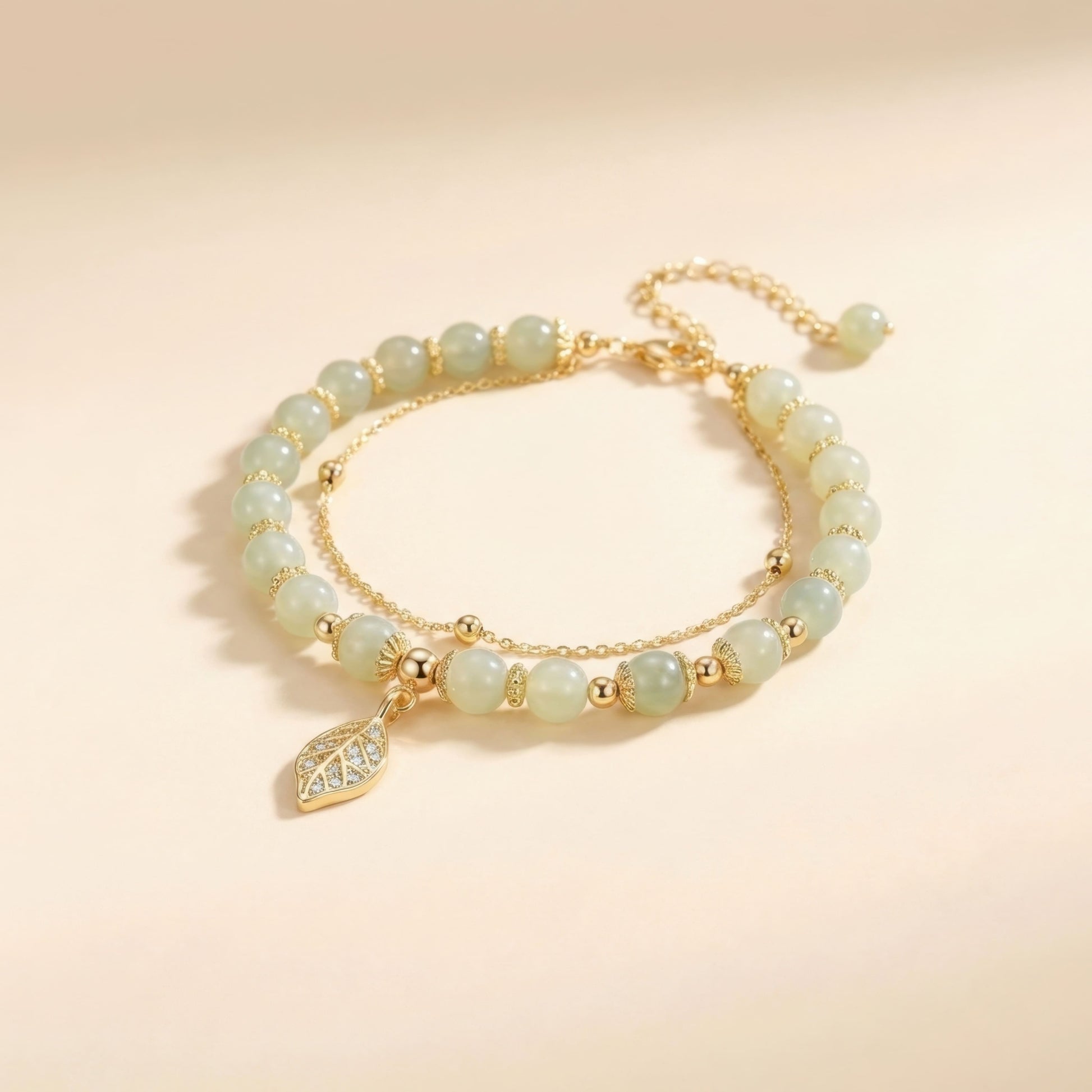 Dvisluoksnė kompozicija atspindi mūsų vidinio ir išorinio pasaulio dermę. Viena eilė, sudaryta iš vientisų akmenų, įkūnija stabilų pamatą ir ramybę, o kita – subtili auksinė grandinėlė – simbolizuoja lengvumą bei gyvenimo džiaugsmą. Auksinio lapelio pakabukas, papuoštas spindinčiomis detalėmis, yra augimo ir klestėjimo metafora, primenanti, kad kiekviena patirtis mums leidžia stiebtis aukštyn link šviesos.